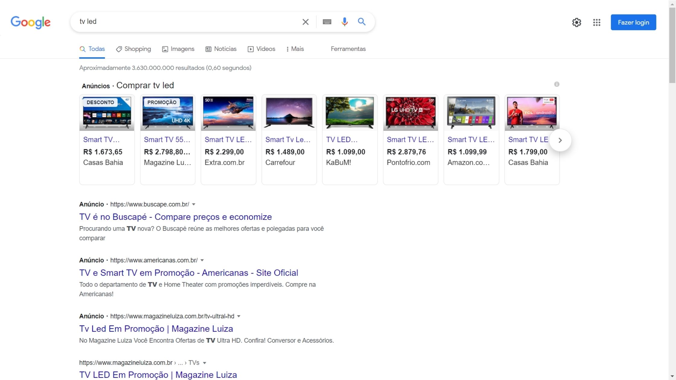 Para acessar ou “ativar” o Google Shopping basta digitar algum produto na barra de busca, por exemplo, o termo “tv led”: