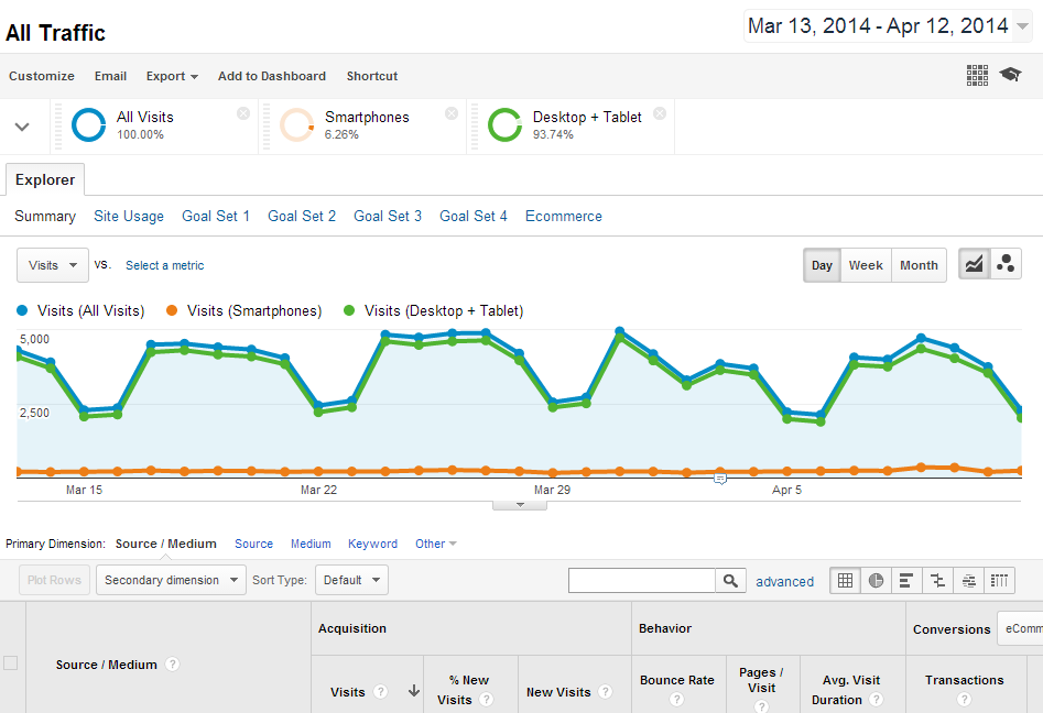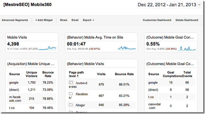 Em seguida, vá ao seu Analytics e entre no relatório de Fontes de Tráfego e segmente por Tráfego Mobile. Veja as taxas de conversões comparando a média do site. Este é o seu termômetro se tudo está ocorrendo bem.