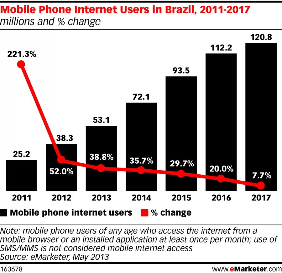 Uma outra visão para o nosso mercado é trazido pelo estudo da eMarketer, apontando um grande crescimento de usuários de internet móvel no nosso país: