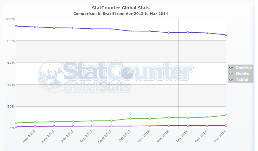 É possível ver através do gráfico da StatCounter (abaixo) que a situação no Brasil é um pouco diferente do que é afirmado pelo Matt, mas podemos notar um bom crescimento no comparativo ano-a-ano:
