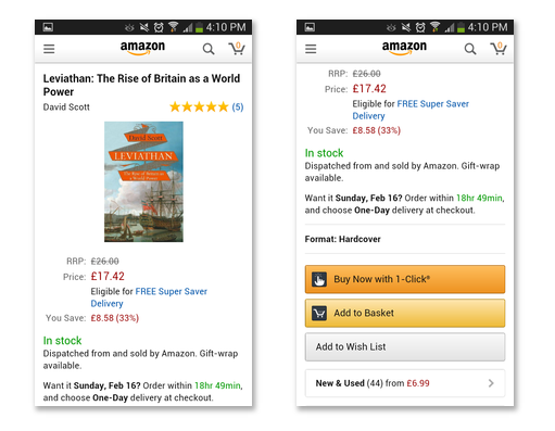 Por fim o exemplo da Amazon, que possui uma informação bem clara de cada produto e além disto o CTA (botões) são bem grandes e fáceis de se clicar: