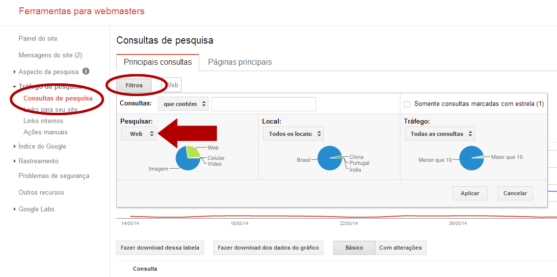 O próximo passo é entender como você aparece nas buscas do Google quando um usuário móvel faz uma consulta que você aparece. Para esta tarefa, você pode utilizar o Google Webmaster Tools. Acesse a seguinte visão: