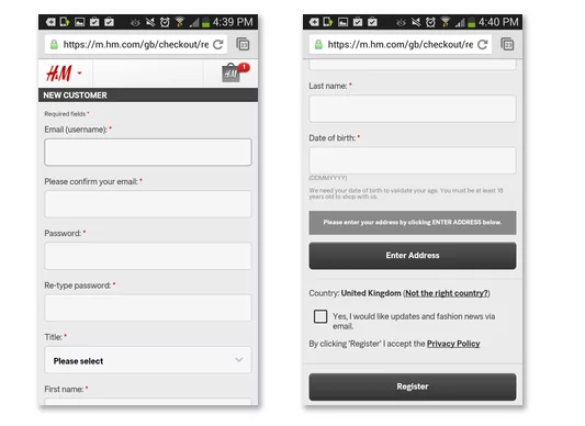 Neste exemplo abaixo da H&M também são bem grandes os campos de formulários, tornando fácil o toque do usuário na tela: