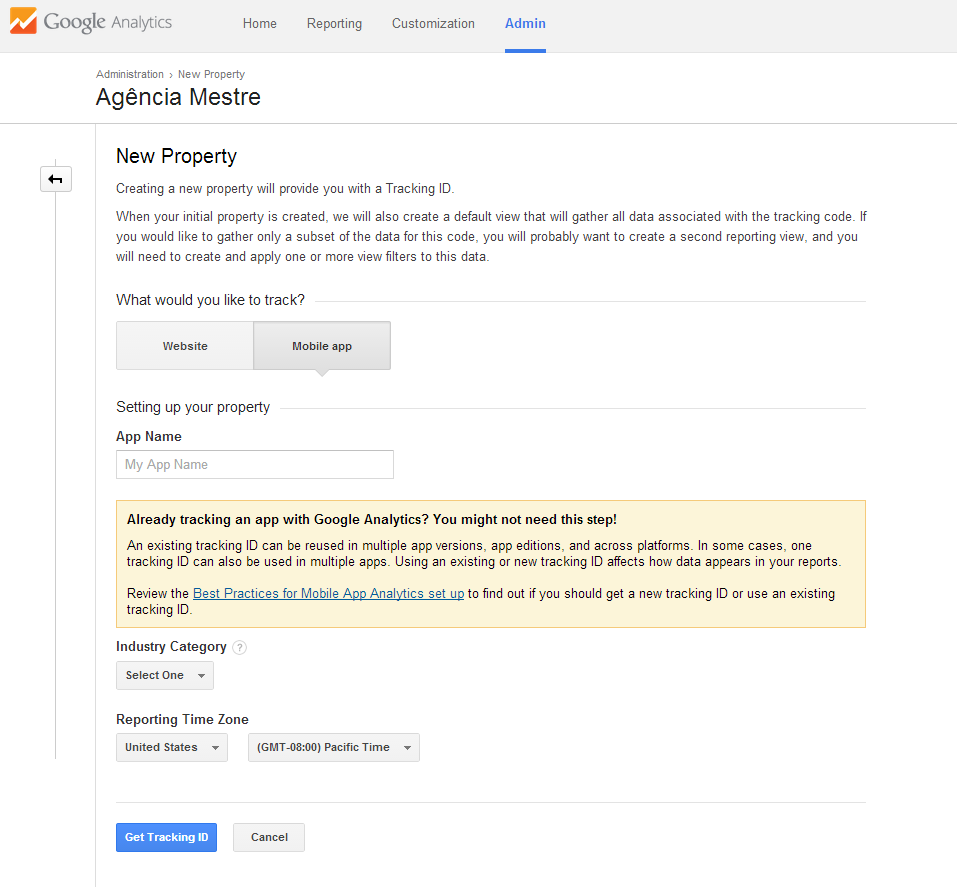 Basta acessar a página Mobile Apps Analytics e você terá uma boa noção de como funciona. O resumo aqui é que existe uma SDK tanto para Android quanto para iOS que você integra ao seu código, juntamente com um ID de uma conta que você cria no Analytics. Este último passo é bem simples, ao criar uma nova propriedade no Analytics basta selecionar “mobile app” e você verá uma lista de opções:
