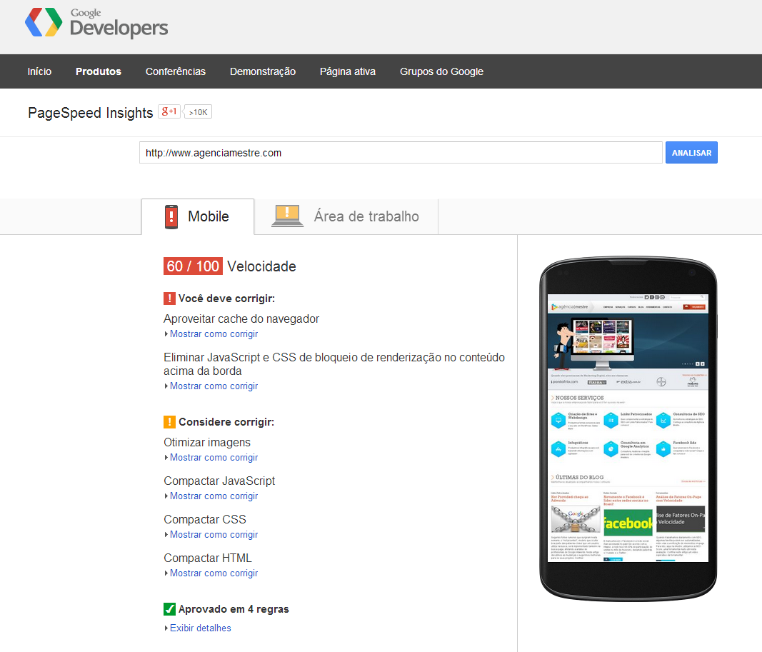 Outro ponto fundamental para o time de SEO é a preocupação com a velocidade do website ao ser acessado por dispositivos móveis. Você pode utilizar aqui o Pagespeed Insights para avaliar a sua otimização pensando em versão móvel: