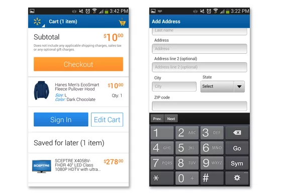 Um dos trabalhos mais simples que você pode pensar é o trabalho com o time de design e front-end para que botões e CTAs sejam bem claros e fáceis de se observar. Neste exemplo da Walmart, os campos são grandes, com botões grandes, facilitando a interação de qualquer usuário em um smartphone. Observe também que o campo, de inserir dados, exibe apenas a versão do teclado com números, quando o campo em questão apenas aceita números. É uma otimização tão simples, mas que poucos fazem em seus formulários.
