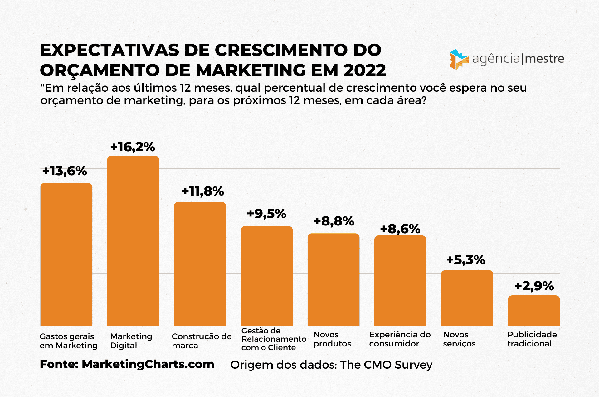 Nas últimas 20 edições da pesquisa, os profissionais de marketing tiveram expectativas parecidas para o crescimento da publicidade tradicional, considerando no máximo 1,4%. Para 2022, estima-se que o investimento chegue a 2,9%, com atenção especial às ações de “construção de marca”.