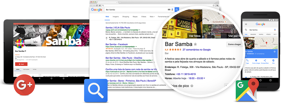 Inclua seu negócio gratuitamente na plataforma do Google. Através do Google Meu Negócio você se conecta diretamente com seus clientes, o que facilita você ser encontrado através da pesquisa do Google, do Google+ ou do Google Maps.
