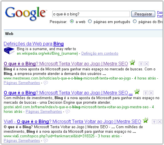 @mlemos: eu procurei “o que é o bing?” no Google e no Bing.