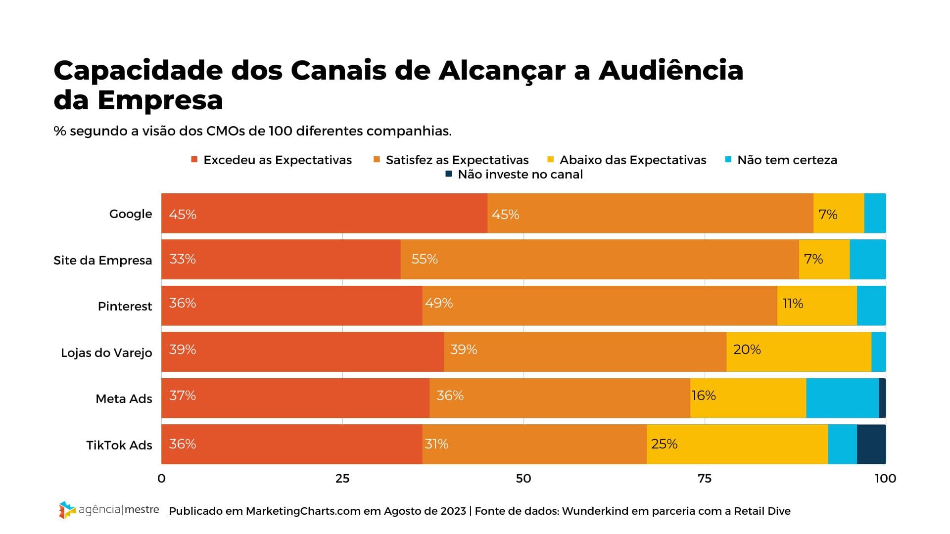 Por enquanto, os CMOs entrevistados pela Wunderkind afirmam que 23% de seus investimentos são destinados ao maior buscador do mundo, enquanto 19% destinam-se ao Meta Ads (Facebook e Instagram).
