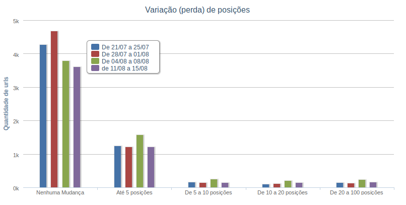 Primeiro, entre os dias 11 e 15 de agosto, a quantidade de urls que perderam posições diminuiu. Ou seja, no geral, a quantidade de sites cadastrados na Rank Tracker que perderam posições foi menor do que a quantidade esperada.