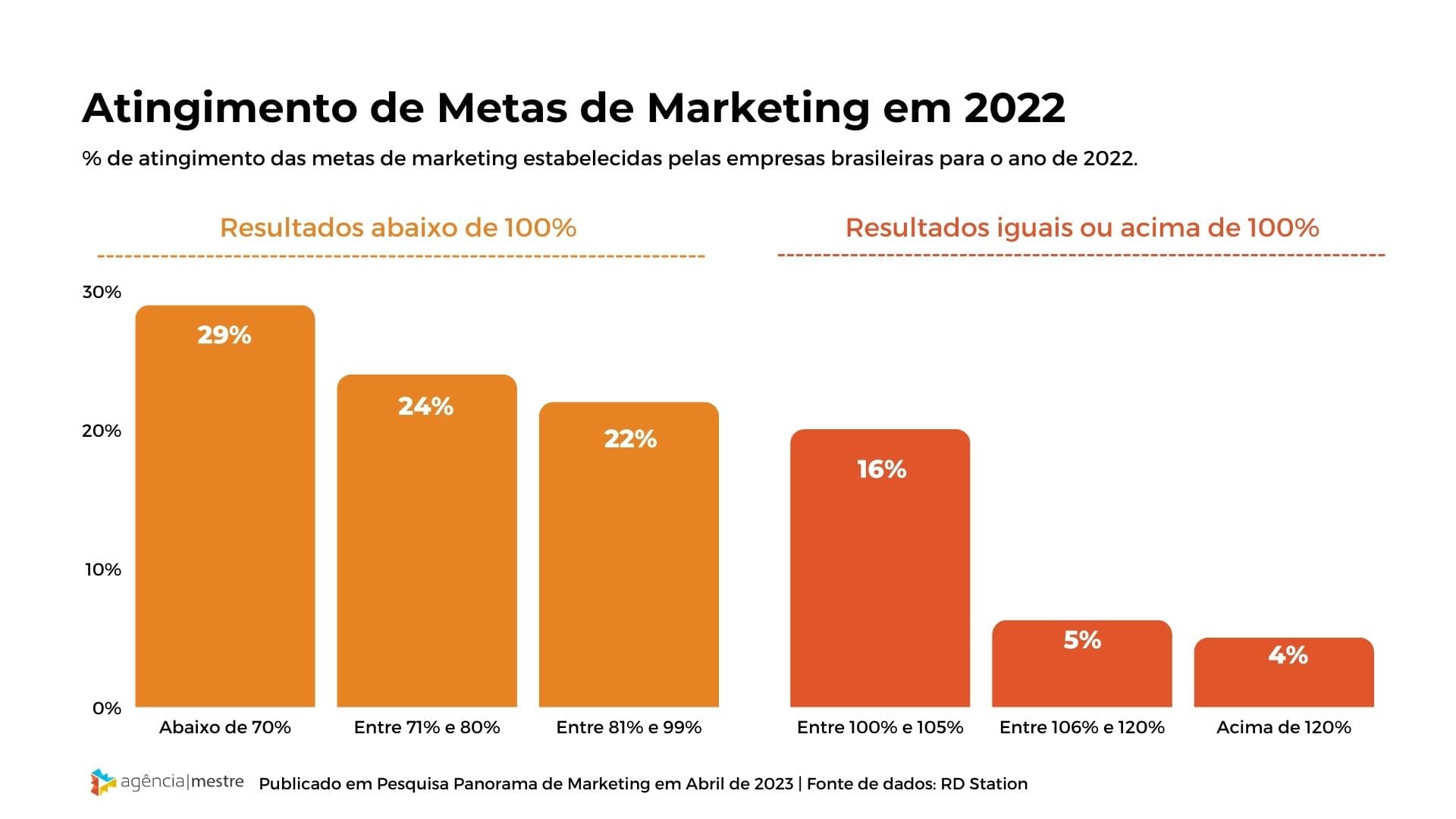 Segundo a pesquisa, 75% das empresas não bateram suas metas de Marketing em 2022. Dentre os resultados, temos: