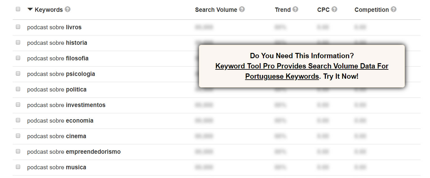 Mesmo não sendo um termo conhecido pela grande massa, as pessoas têm buscado cada vez mais descobrir novos podcasts para ouvir. O interessante é que essas buscas são realizadas em diversos nichos de mercado. Utilizando a ferramenta Keyword Tool, percebemos a variedade: