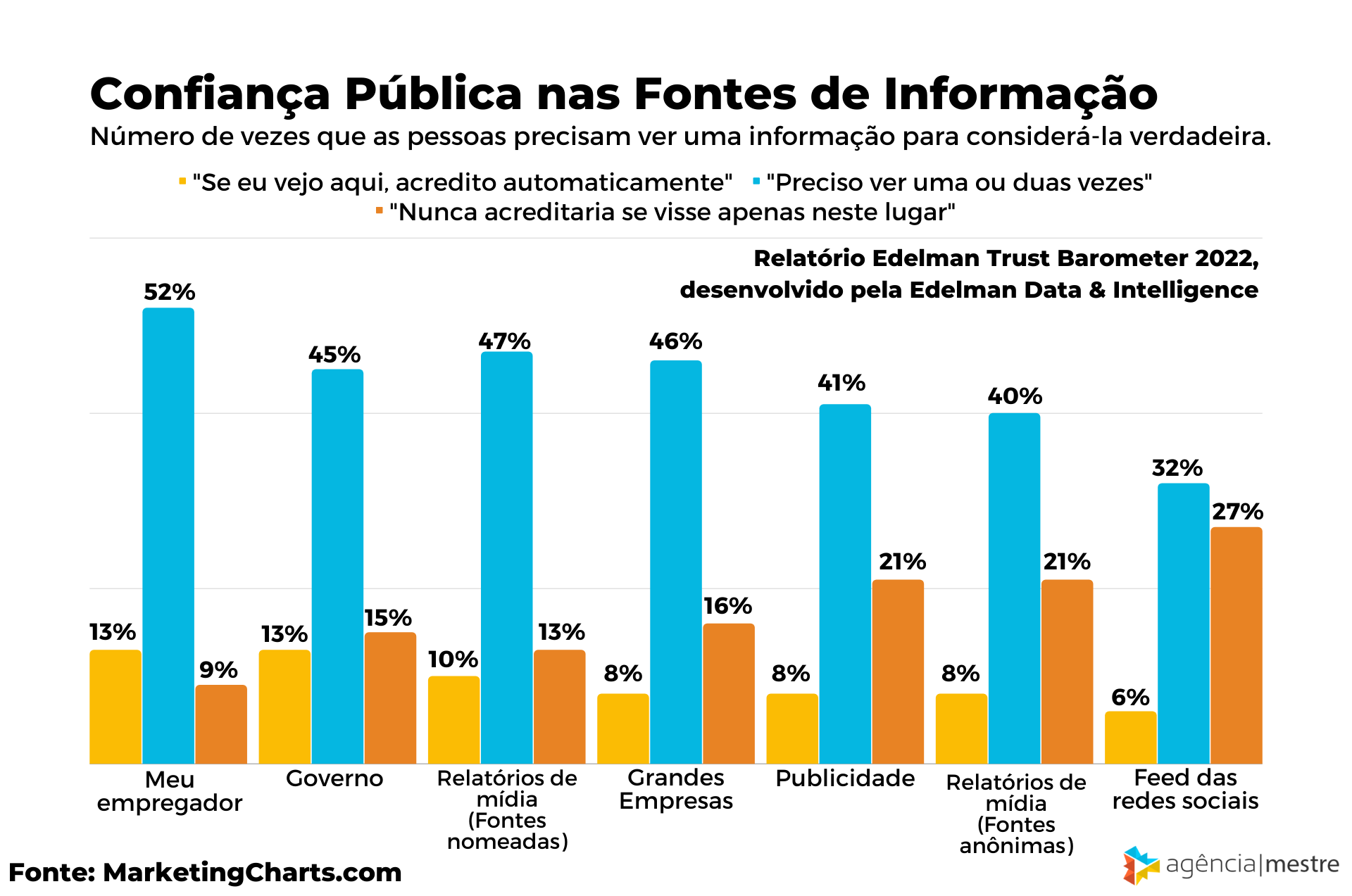 O relatório, realizado há mais de 20 anos, estuda a confiança da população nas empresas, ONGs, governos e canais de informação. Os resultados da última pesquisa revelam que um quinto (21%) dos entrevistados diz que nunca acreditará em uma informação, se a publicidade for o único lugar onde eles vêem isso.