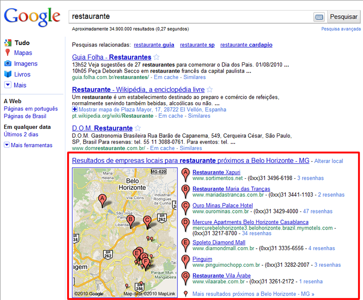 No exemplo acima, foi feita uma pesquisa por “restaurante” no Google. Onde o quarto resultado, assinalado na imagem, corresponde a um resultado de empresas cadastradas no Local Places.