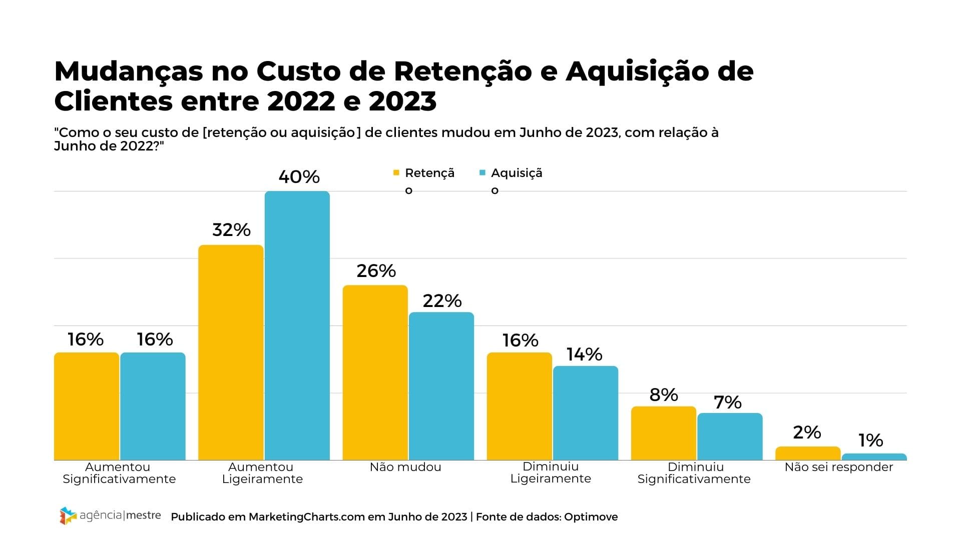 No entanto, o que chama a atenção é que os custos de marketing estão aumentando tanto para a aquisição quanto para a retenção de clientes. Cerca de 56% dos entrevistados afirmaram que o custo do marketing de aquisição aumentou significativamente (16%) ou um pouco (40%) em relação ao ano anterior.