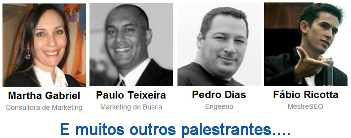 O evento já conta com 19 palestrantes e, segundo a organização, novas confirmações já estão por vir. Entre os confirmados podemos citar a grande Martha Gabriel, uma das maiores personalidades do marketing online brasileiro; Pedro Dias, o ex-Googler, que possuía o algoritmo em suas mãos; Paulo Teixeira, um dos desbravadores do SEO brasileiro e autor do primeiro livro de SEO do nosso país. Poderíamos citar toda a lista de palestrantes mas você mesmo pode conferir. Pela Agência Mestre, eu, Fábio Ricotta, que estarei lá mostrando os meus conhecimentos na área e esperamos que vocês compareçam.