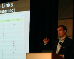 Em seguida, foi a vez de outro membro da equipe do SEOmoz a se apresentar. Nick Gerner subiu ao palco com a palestra “Getting the Most out of Linkscape” onde iniciou mostrando os principais fatores de rankeamento do algoritmo do Google. Falou ainda sobre o porque do índice da Linkscape ser baixo, mas informou que é uma boa representação do que acontece na web. Ele citou ainda as ferramentas de busca do links quebrados, a lsvisualize e anunciou a nova ferramenta de análise de links de concorrentes, a link-intersect. Por fim, ressaltou a importância dos Q/A do SEOmoz e ainda listou uma série de artigos publicados pelo SEOmoz que relatam a evolução da Linkscape.
