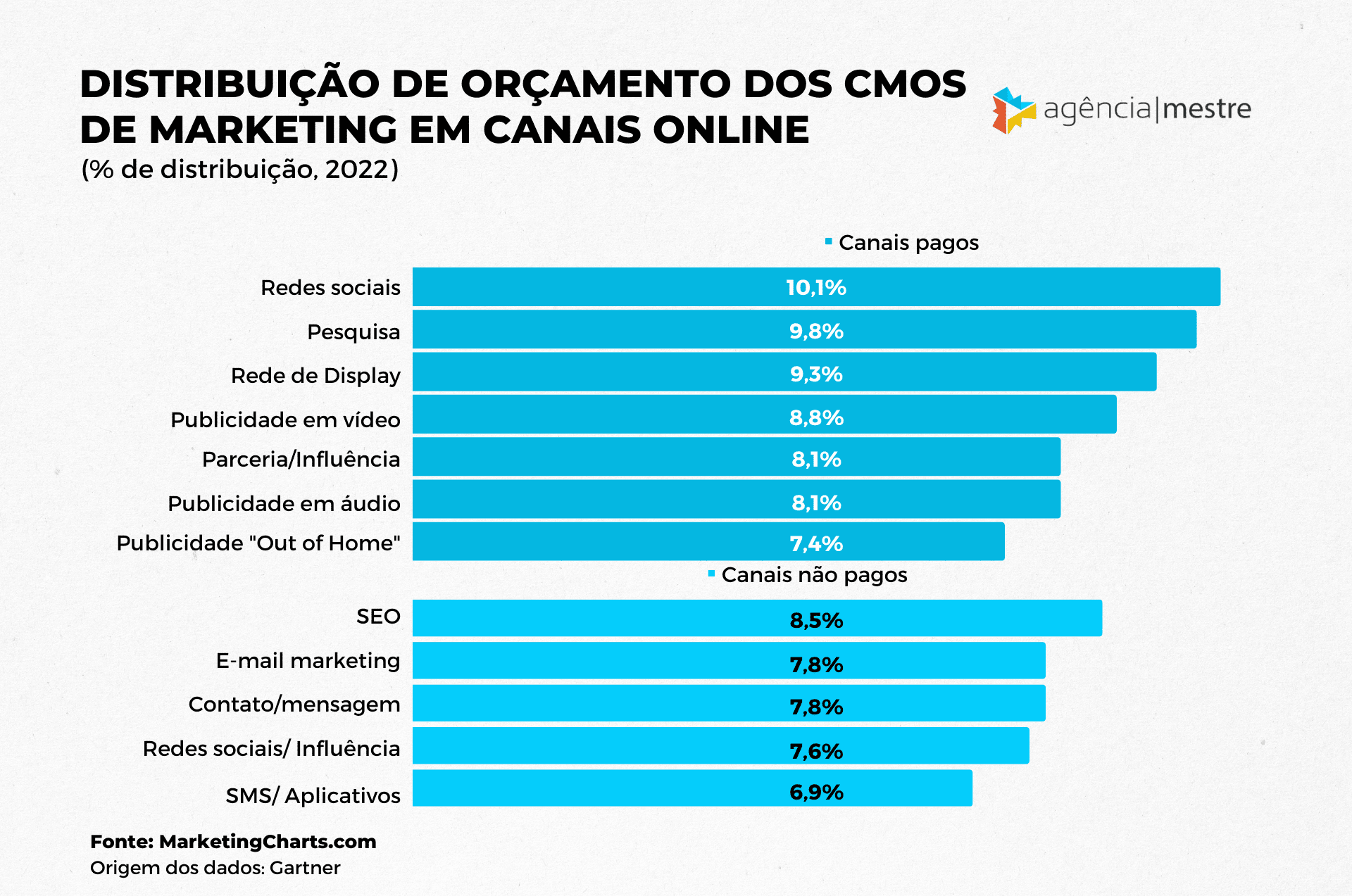 Dentre os canais não pagos, o investimento em SEO está no topo com 8,5% da alocação do orçamento digital. Em seguida temos o e-mail marketing (7,8% de participação nos orçamentos digitais), conteúdo e mensagens (7,8%) e marketing orgânico de influenciadores sociais (7,6%).
