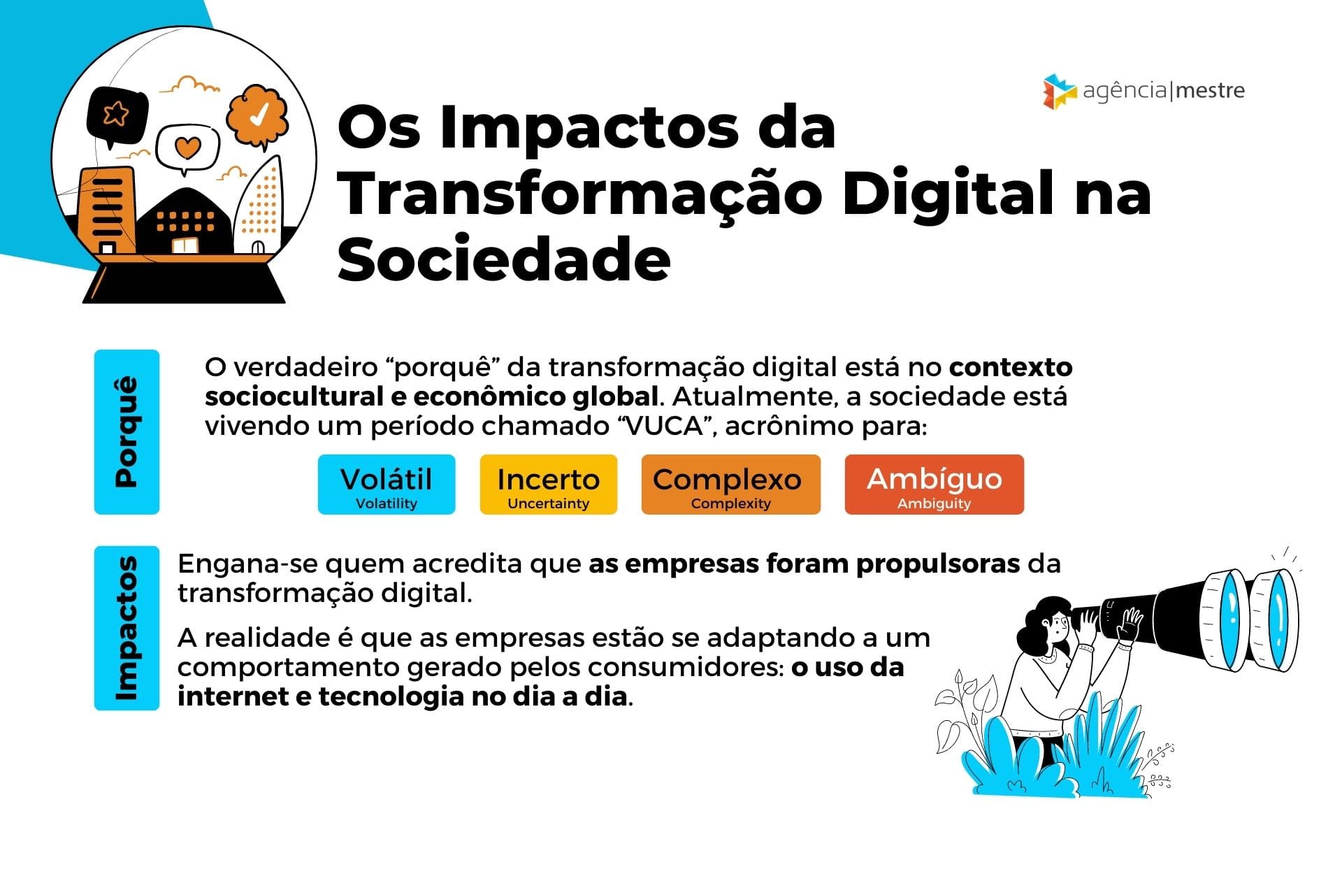 O verdadeiro “porquê” da transformação digital está no contexto sociocultural e econômico global. Atualmente, a sociedade está vivendo um período chamado “VUCA”, acrônimo para Volátil (Volatility), Incerto (Uncertainty), Complexo (Complexity) e Ambíguo (Ambiguity).