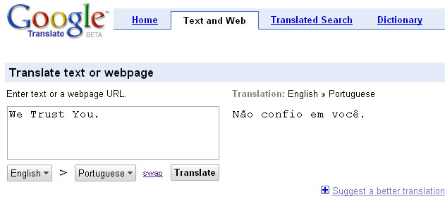É muito provável que vários usuários do sistema utilizaram aquele link “Suggest a better translation” para manipular a resposta e sair do “Nós confiamos em você”. O pessoal ainda não desistiu de brincar com o Google e o Google ainda não utiliza um sistema mais rígido de proteção das traduções. Melhor para nós, que nos divertimos!