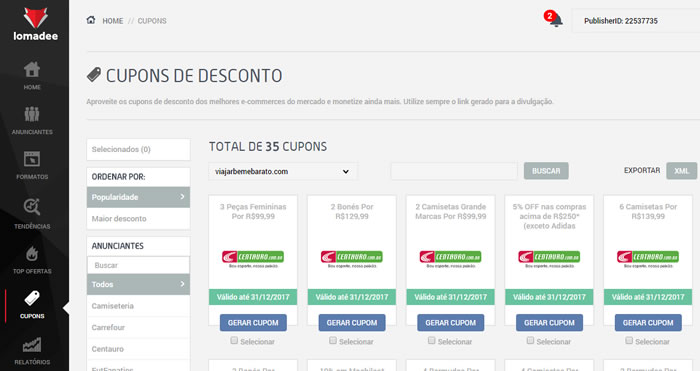 Além de todos esses formatos, algumas lojas virtuais disponibilizam também cupons de desconto, os quais você pode obter no menu “Cupons” da Lomadee. Em geral, são cupons que oferecem uma porcentagem de desconto em todo o site do anunciante.