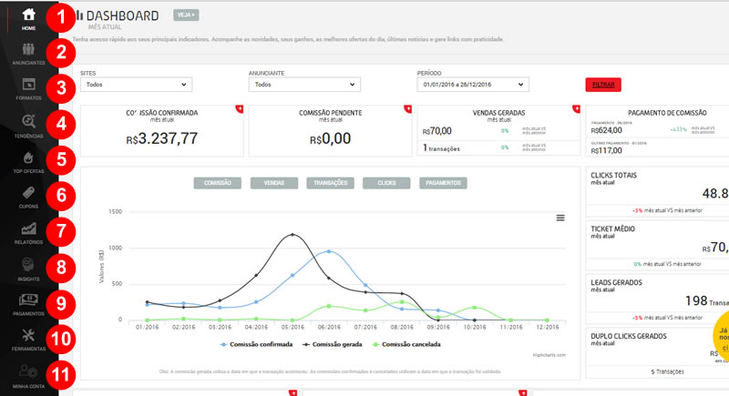 1) Em “Home” você fica por dentro das novas campanhas que pode promover, visualiza comunicados e gráficos de desempenho de suas vendas;