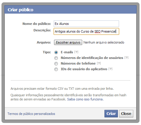 A grande mágica é que ele cria listas segmentadas de pessoas retiradas da sua lista de e-mails e telefones para que você crie anúncios para elas apresentando seu serviço dentro da rede social. Ou seja, você faz o upload do seu mailing, o Facebook compara os e-mails (ou telefones) com os e-mails (ou telefones) de usuários cadastrados na rede e pronto! Você achou seu cliente e está a um passo de anunciar para ele dentro do Facebook.