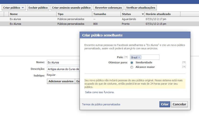 Depois de aceito, vá novamente até o Gerenciador de Anúncios do Power Editor ou da própria plataforma do Facebook e produza seu anúncio normalmente, mas, na hora de escolher seu público, vá em “Público Personalizado” e assinale sua lista LookaLike recém cadastrada.