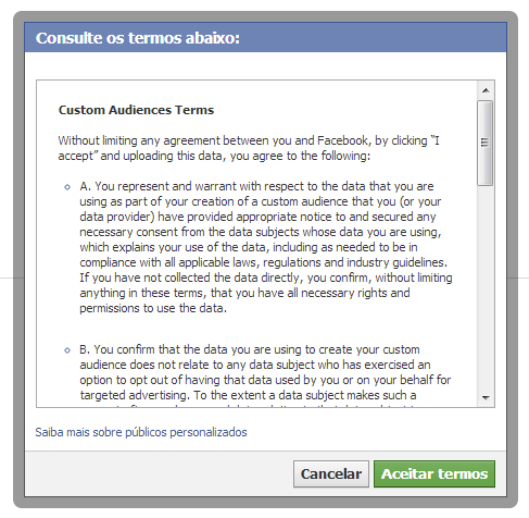 Detalhe: o Facebook vai pedir que você concorde com os termos de Customização de Audiência. Não deixe de aceitar para que o processo seja realmente feito.