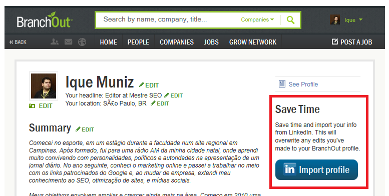 O mais curioso desta história é que, se são concorrentes, o BranchOut possui um link que faz a importação automática de seu perfil no LinkedIn para dentro dele, facilitando o preenchimento das informações básicas assim que você cria sua conta.