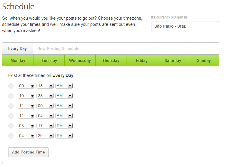 Uma das funcionalidades que eu mais gostei foi a de configurar horários para postagem. Dentro do Buffer App você pode escolher, por perfil de rede social, qual os horários que você deseja que a plataforma publique conteúdo. Por exemplo, para o meu Twitter, eu escolhi alguns horários chave: