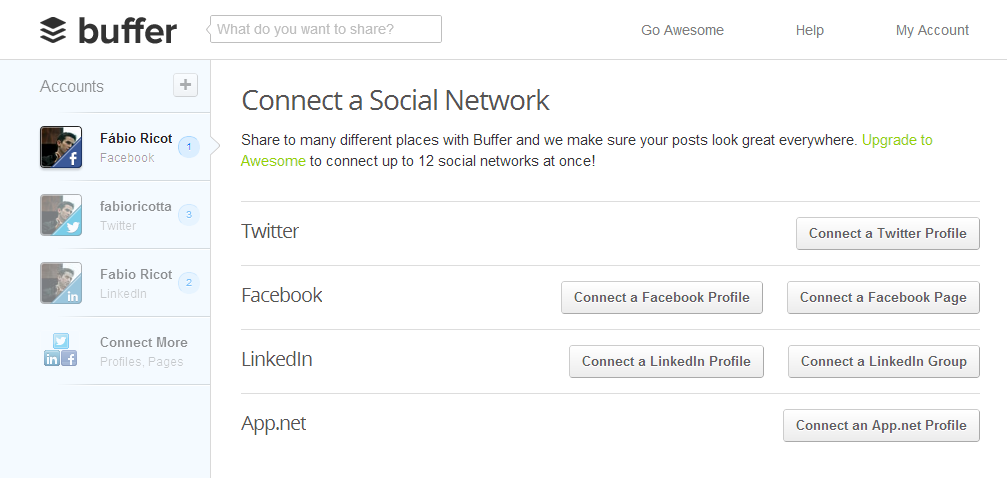 Conheci há alguns dias atrás uma plataforma muito bacana, chamada Buffer App, e gostaria de compartilhar minhas impressões com vocês. Se você é daqueles que tem contas bem ativas ou quer fornecer um bom conteúdo ao seu público mas não tem muito tempo para entrar no Facebook, Twitter e/ou Linkedin, esta é a plataforma ideal para você. O Buffer App é um local onde você pode centralizar todas as suas postagens, definindo horários padrão para os posts e ainda consegue ver todas as estatísticas das postagens. É uma forma bem prática e confiável para gerenciar os seus perfis.