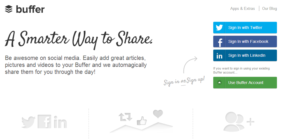 Criar uma conta no Buffer App é simples. Basta acessar a página inicial do projeto e clicar em uma das formas de login: