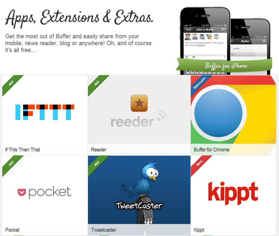 Um dos pontos positivos do Buffer App é ter a integração com diversos aplicativos. Alguns conhecidos como o Pocket, IFTTT, Instapaper, WordPress e os tradicionais navegadores Chrome e Firefox estão integrados com a plataforma. Basta baixar cada um dos aplicativos e usá-los de forma integrada ao Buffer App.