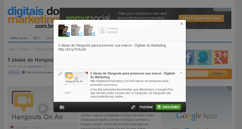 Postar é uma tarefa muito simples com o Buffer App. Eu instalei aqui a extensão para Chrome e com isto eu tenho um botão na minha toolbar, onde, se eu gostar de um artigo, eu posso clicar no botão e uma caixa se abre: