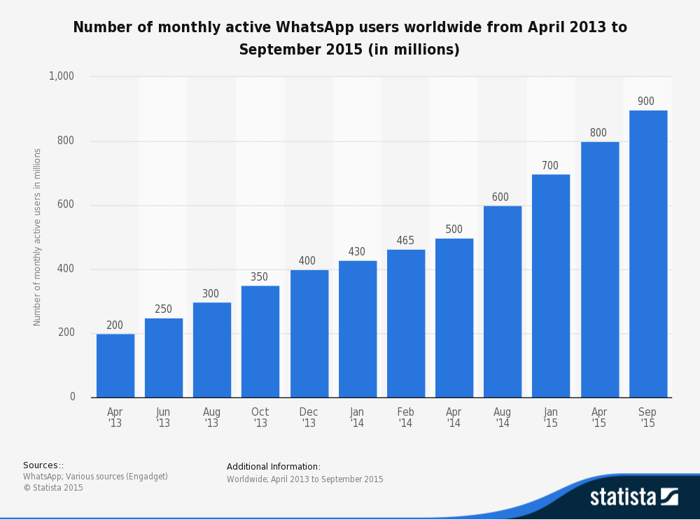 O Whatsapp está muito próximo de atingir 1 bilhão de usuários se seguir o crescimento que a própria empresa vem reportando. Nos últimos cinco meses, segundo Jan Koum, co-fundador do WhatsApp, o serviço de mensagens instantâneas ganhou cerca de 100 milhões de utilizadores referente ao demonstrativo anterior, somando um total de mais de 900 milhões de utilizadores.