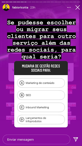 As enquetes são muito úteis para você conhecer o seu público, tirar dúvidas e trabalhar o marketing de conteúdo nas redes sociais da sua empresa. Mas além de perguntas, essa é uma forma de fazer o usuário interagir e sentir que está no controle: você pode dar duas opções e pedir que decidam entre elas.