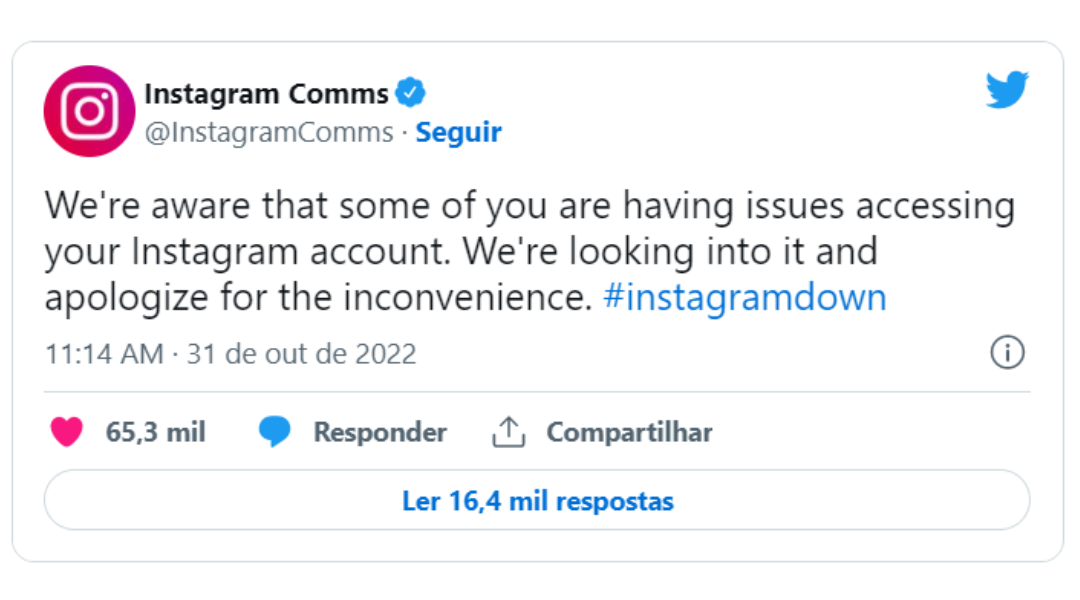 “Estamos cientes de que alguns de vocês estão tendo problemas para acessar sua conta do Instagram. Estamos analisando e pedimos desculpas pelo transtorno. #instagramdown”