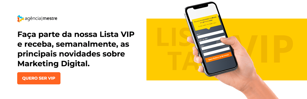 Faça parte da nossa Lista VIP e receba toda semana as principais novidades sobre Marketing Digital. Participe também do grupo da Agência Mestre no Telegram e receba novidades na palma da sua mão!