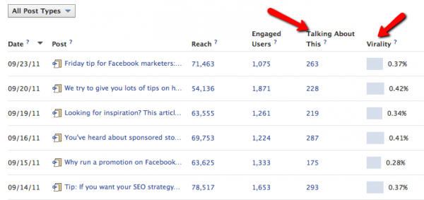 É uma métrica que atualiza diariamente e pode ser vista em até uma semana. Trata-se de um bom medidor do quanta conversa está sendo gerada por uma página no Facebook. É um bom indicador de como as páginas estão indo e como gerar mais conteúdo em torno delas.