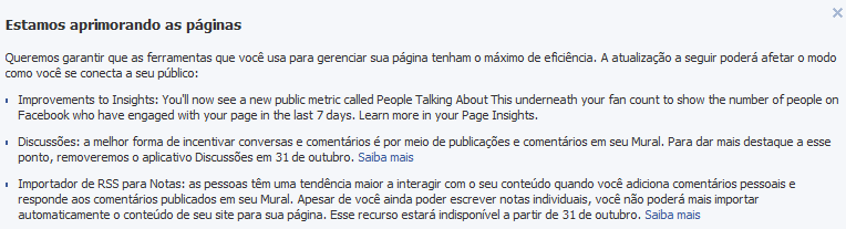 O “estão falando sobre isso” já está ativo para todos, mas muito ainda não receberam o novo Insights que aplicar as alterações, criando, inclusive, um menu próprio para analisarmos dados mais detalhados sobre a nova métrica. O Facebook tem posto um aviso nas fan pages avisando das mudanças mais novas: