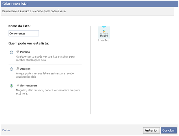 E dê um nome para sua lista. Não esqueça de assinalar que só você pode ter acesso a esta lista.