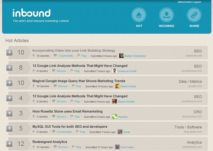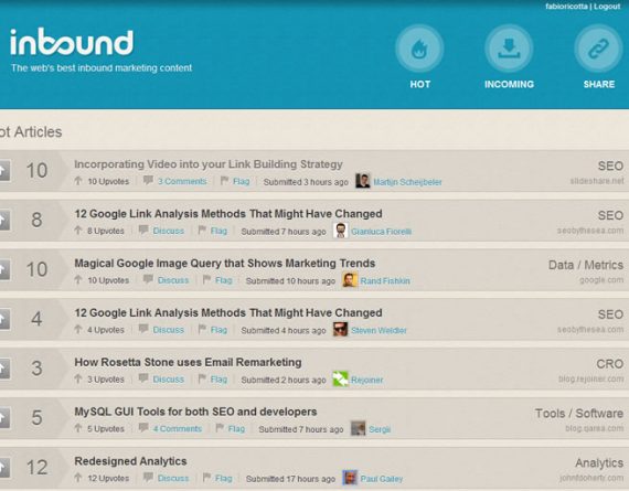 Recentemente, tomei conhecimento de um projeto muito bacana, o Inbound.org, idealizado e criado por duas mentes brilhantes, o Rand Fishkin, do SEOmoz, e o Dharmesh Shah, da HubSpot. Neste projeto, eles criaram um agregador de notícias para a área de marketing online, onde todo o conteúdo postado é gerenciado pela comunidade e organizado em diversas categorias super relevantes.