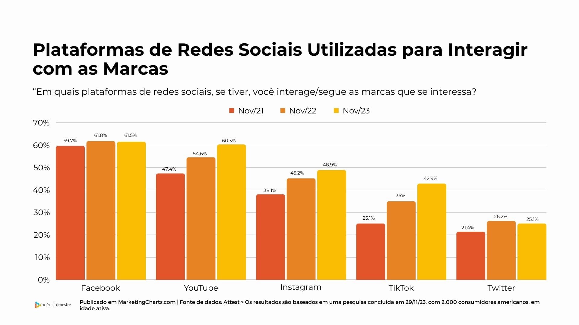 Quando perguntado sobre “em quais plataformas de redes sociais você interage/segue as marcas que se interessa?”, mais de 60% dos usuários apontou o YouTube, tornando-a em uma das redes sociais que teve o crescimento mais significativo na interação entre os consumidores e as marcas: