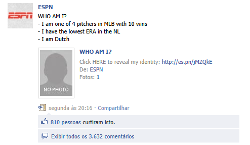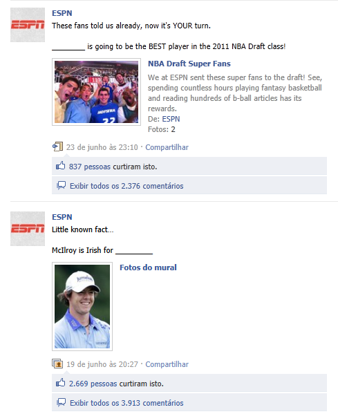 Neste ponto, bato palmas para os norte-americanos, tão aclamados por surpreender em suas ações publicitárias. Peguei como exemplo de criatividade, através de uma simples postagem diferente, a página da ESPN Internacional. Além dos posts comuns de notícias, vídeos e perguntas para os fãs e espectadores, a fan page brinca com os usuários.