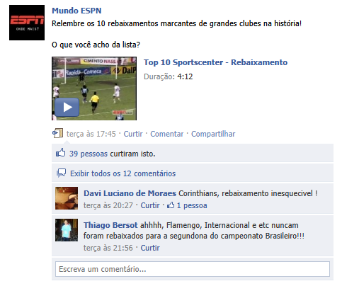 Como bom fã de esporte, separei casos de canais e meu time querido. As idéias são as mesmas dos exemplos já citados, como a da ESPN Brasil, que divulga os vídeos que são transmitidos na televisão, recebendo bom feedback de seus internautas: