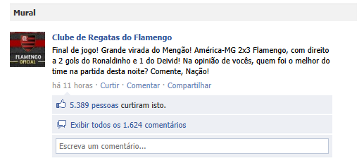 O Flamengo, através de sua fan page oficial, posta diversas coisas relacionadas ao clube e seu dia-a-dia e uma simples divulgação de resultado de jogo faz com que seus torcedores agitem a página com comentários e likes: