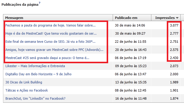 No fim das contas, a resposta para este tipo de ação veio em forma de estatística do Facebook Insights. Reparem que, do último mês pra cá (quando começamos exatamente a praticar essa interação), os top posts de impressões em nossa fan page foram justamente aqueles em que “conversamos” com nossos fãs:
