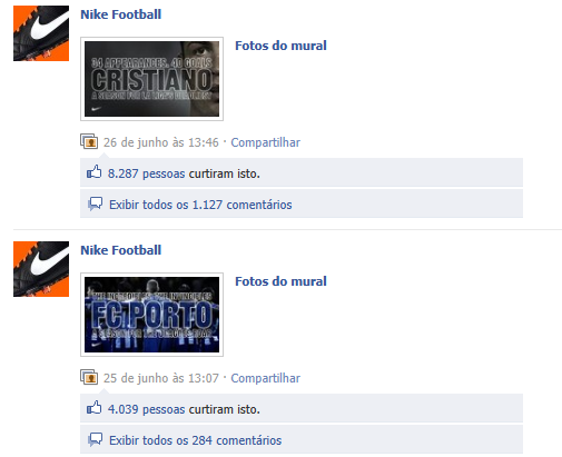 Outro exemplo parecido é o da Nike, que eu sua fan page de futebol, cria peças de jogadores e clubes que fornece o material esportivo. Cada imagem também gera um grande buzz: